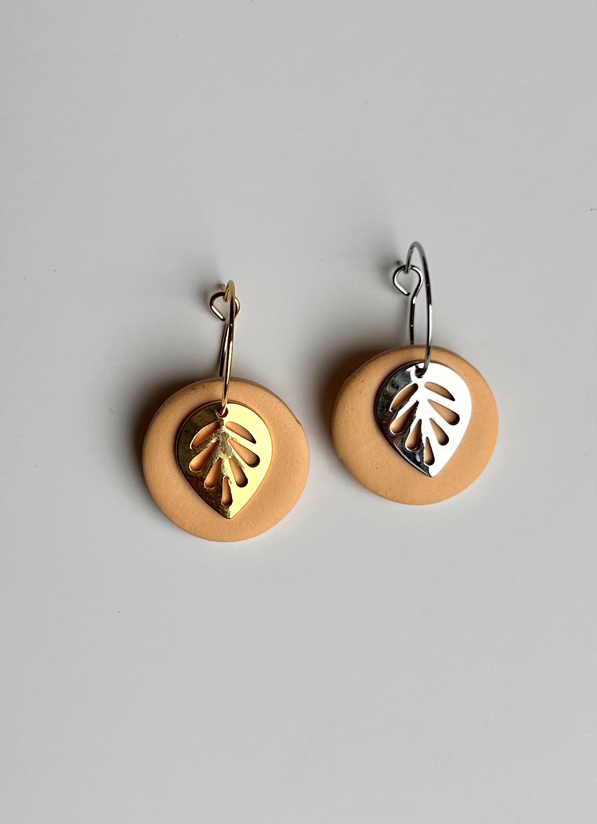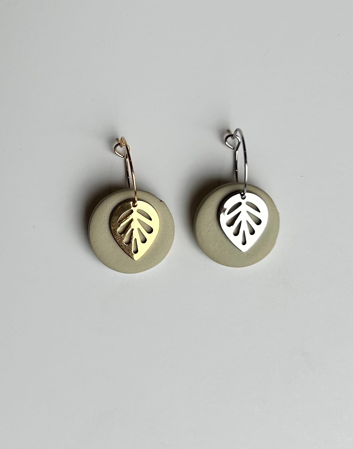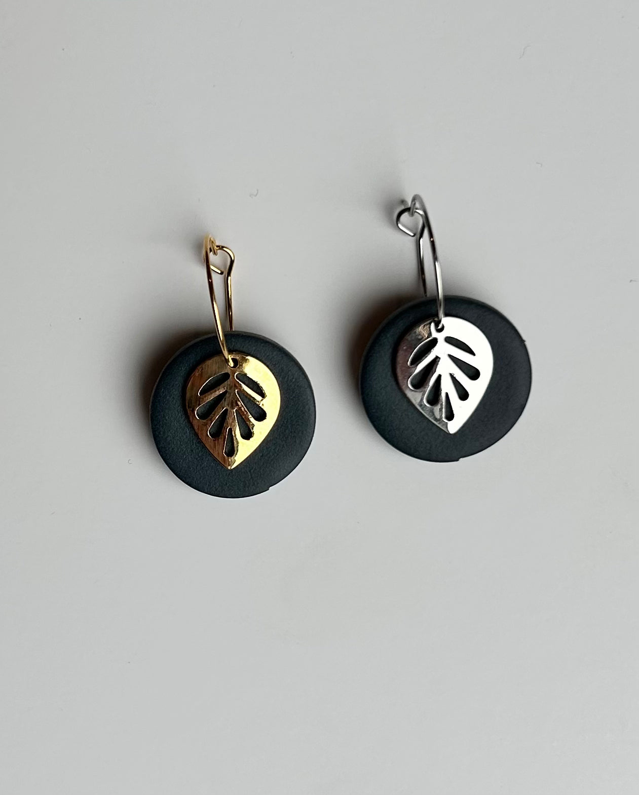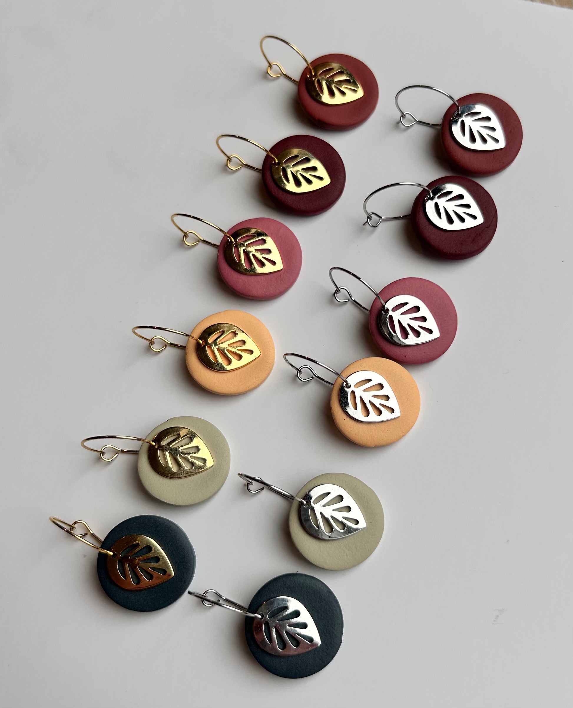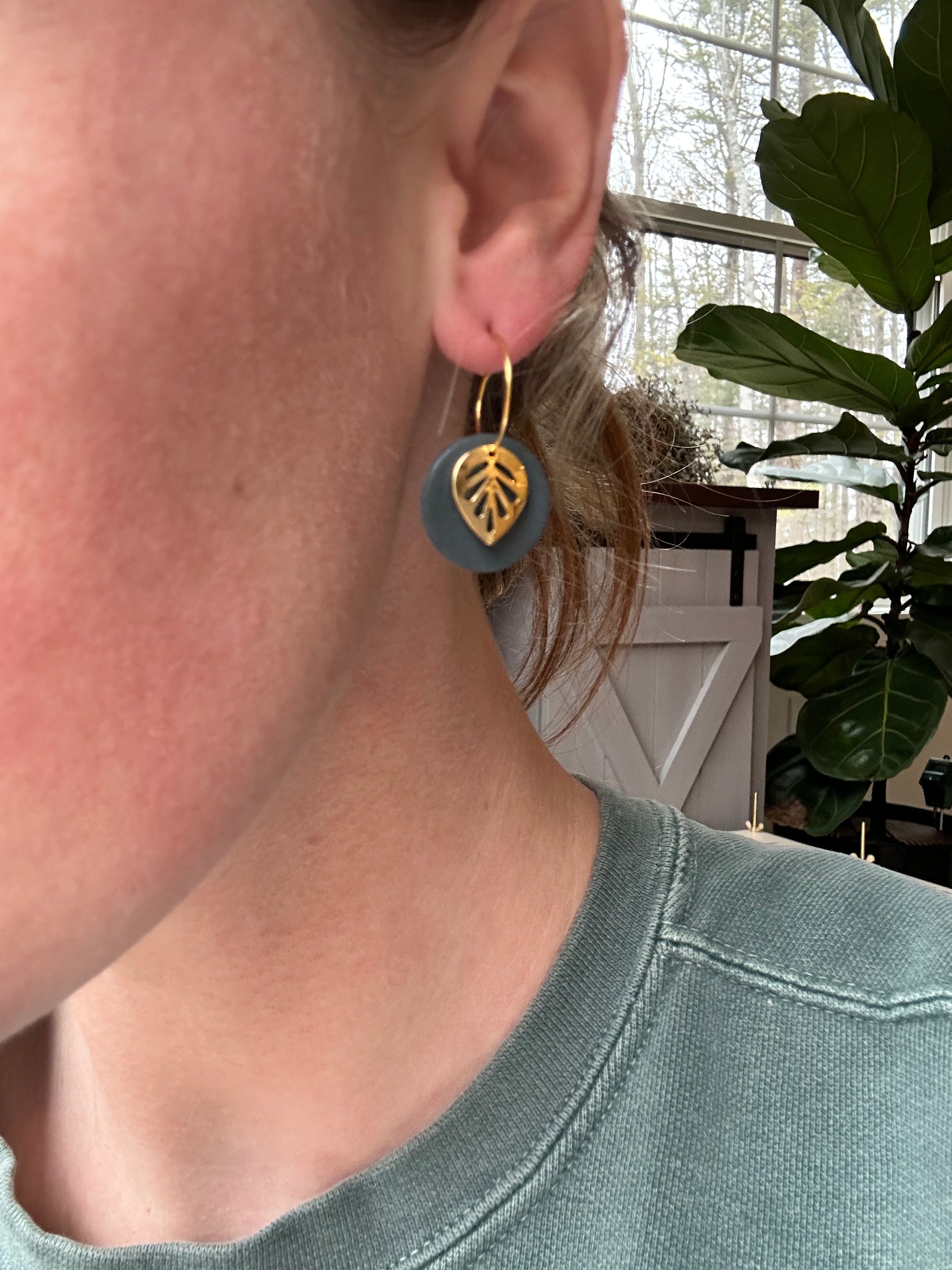 The Leaf Dangle earring is a great earring for any occasion. The metal leaf and clay circle move separately from one another and when you move they move with you! Choose between gold or silver ear wire.