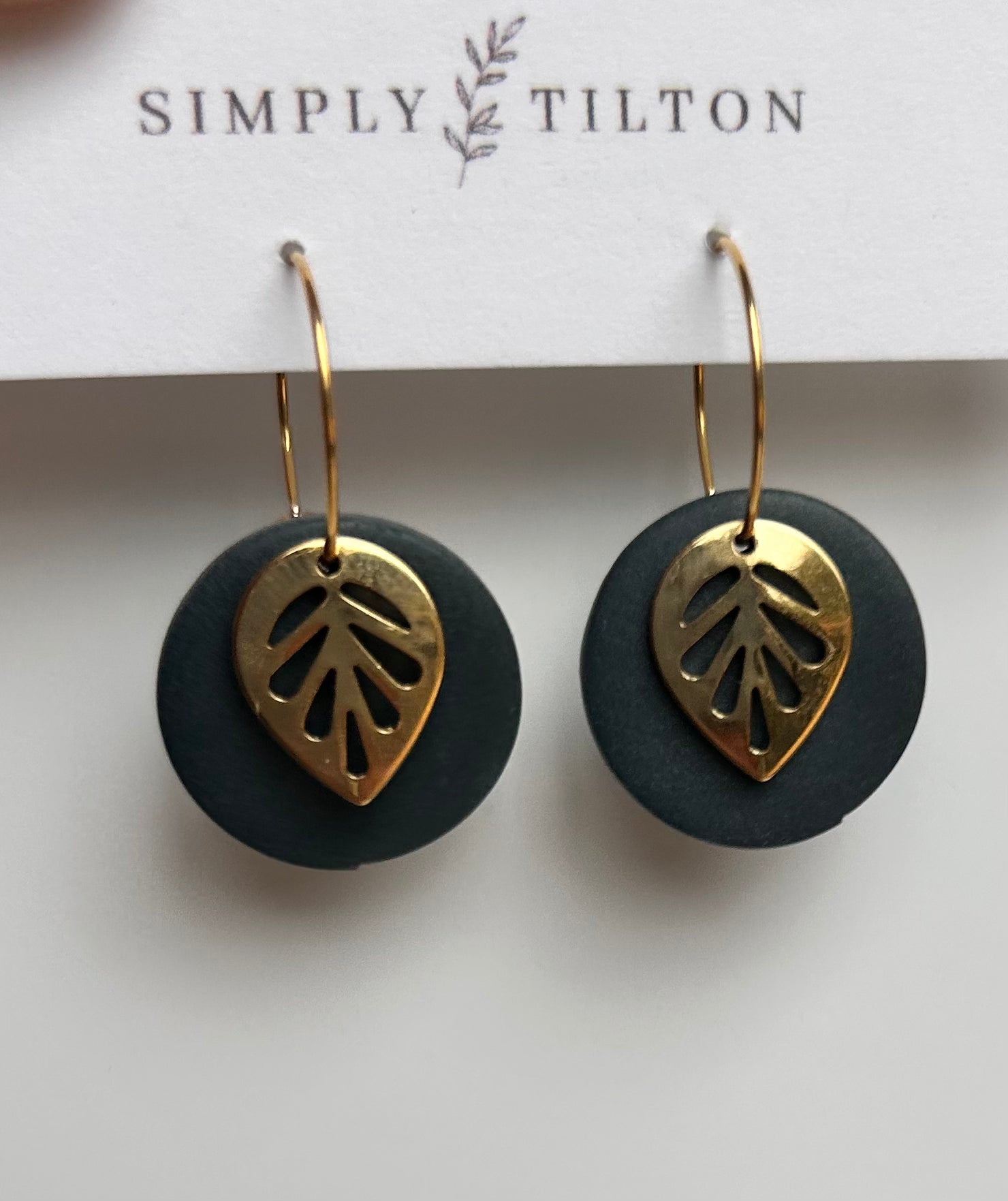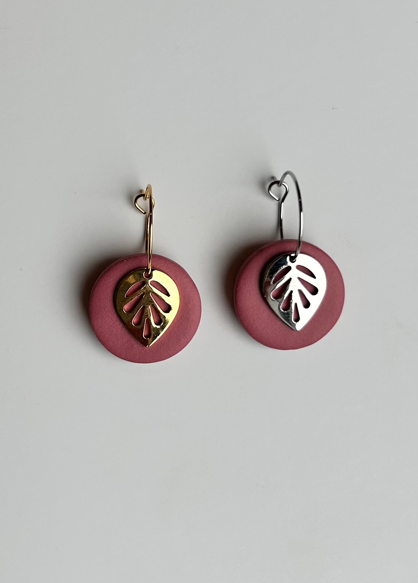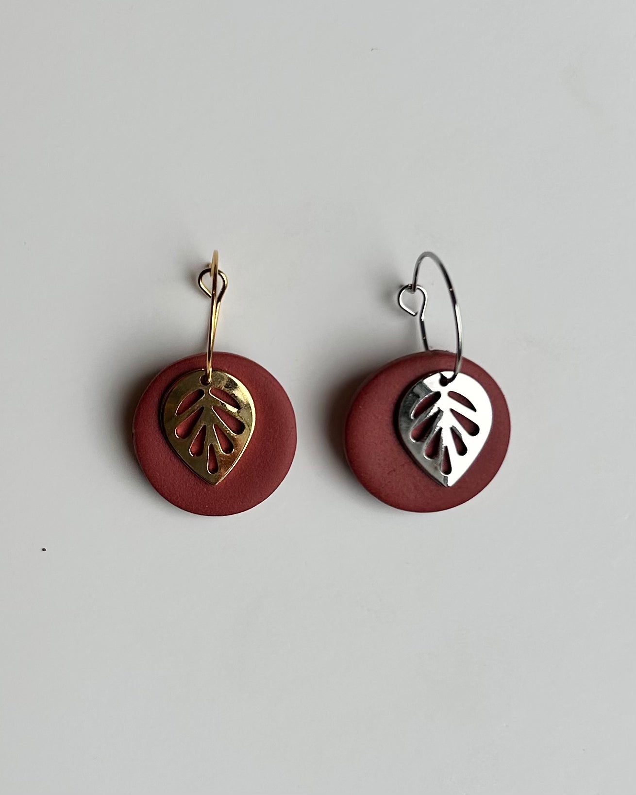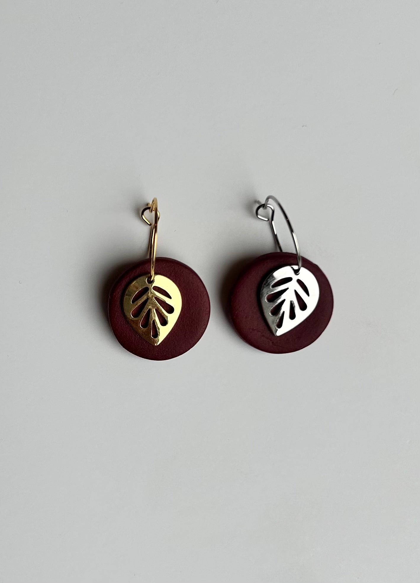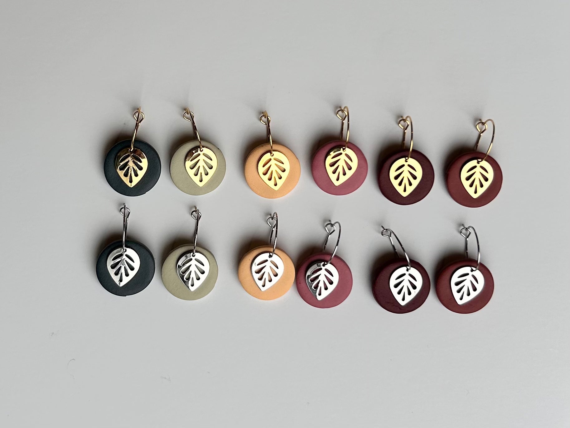 The Leaf Dangle earring is a great earring for any occasion. The metal leaf and clay circle move separately from one another and when you move they move with you! Choose between gold or silver ear wire.